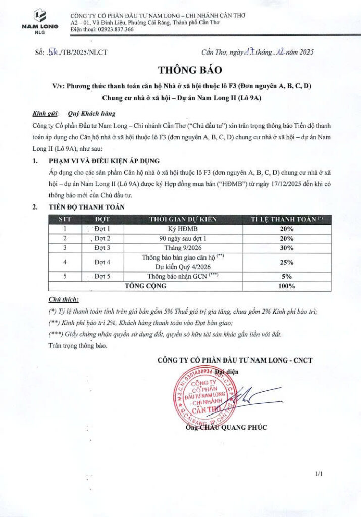 Theo thông báo, phương thức này áp dụng cho các khách hàng ký hợp đồng mua bán căn hộ nhà ở xã hội từ ngày 17/12/2025 cho đến khi có thông báo mới của chủ đầu tư.